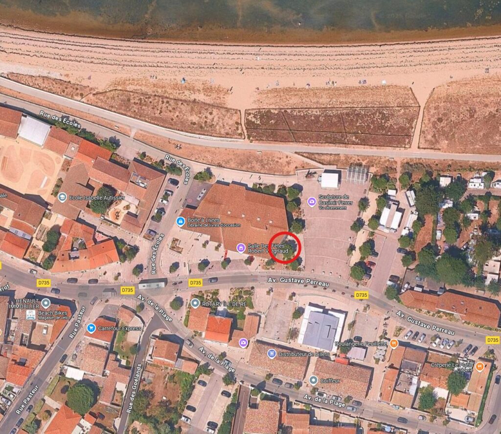 La stèle en Hommage aux Marins Disparus est installée sur le mur du bâtiment en face de la mairie de Rivedoux-Plage, près du monument aux morts.