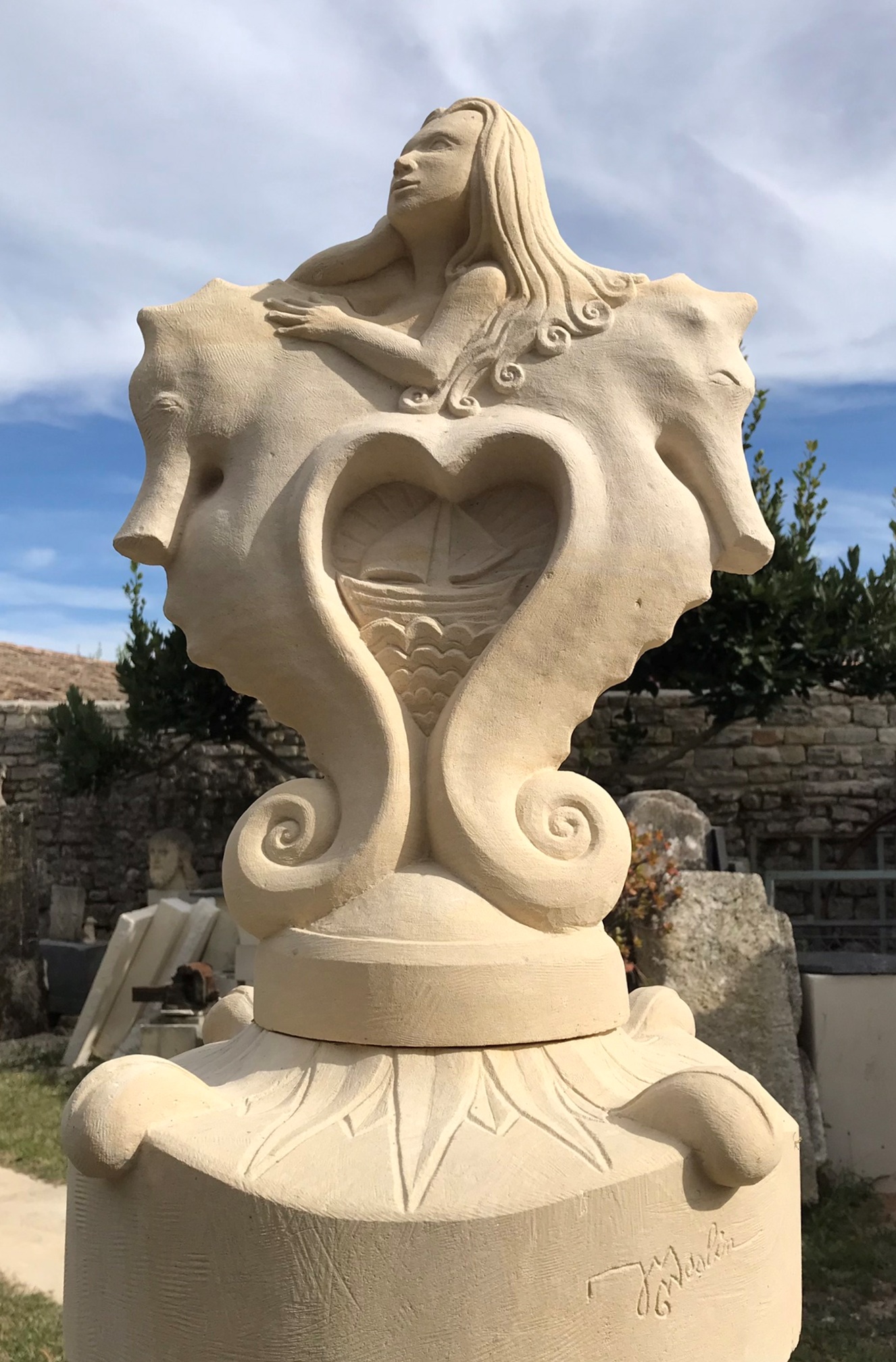 En parallèle, je sculpte selon mon inspiration, également selon les demandes des uns et des autres. Une reine de l’océan, des personnages singuliers, oniriques, une nymphe, un hippocampe, des formes naissantes, sensuelles.