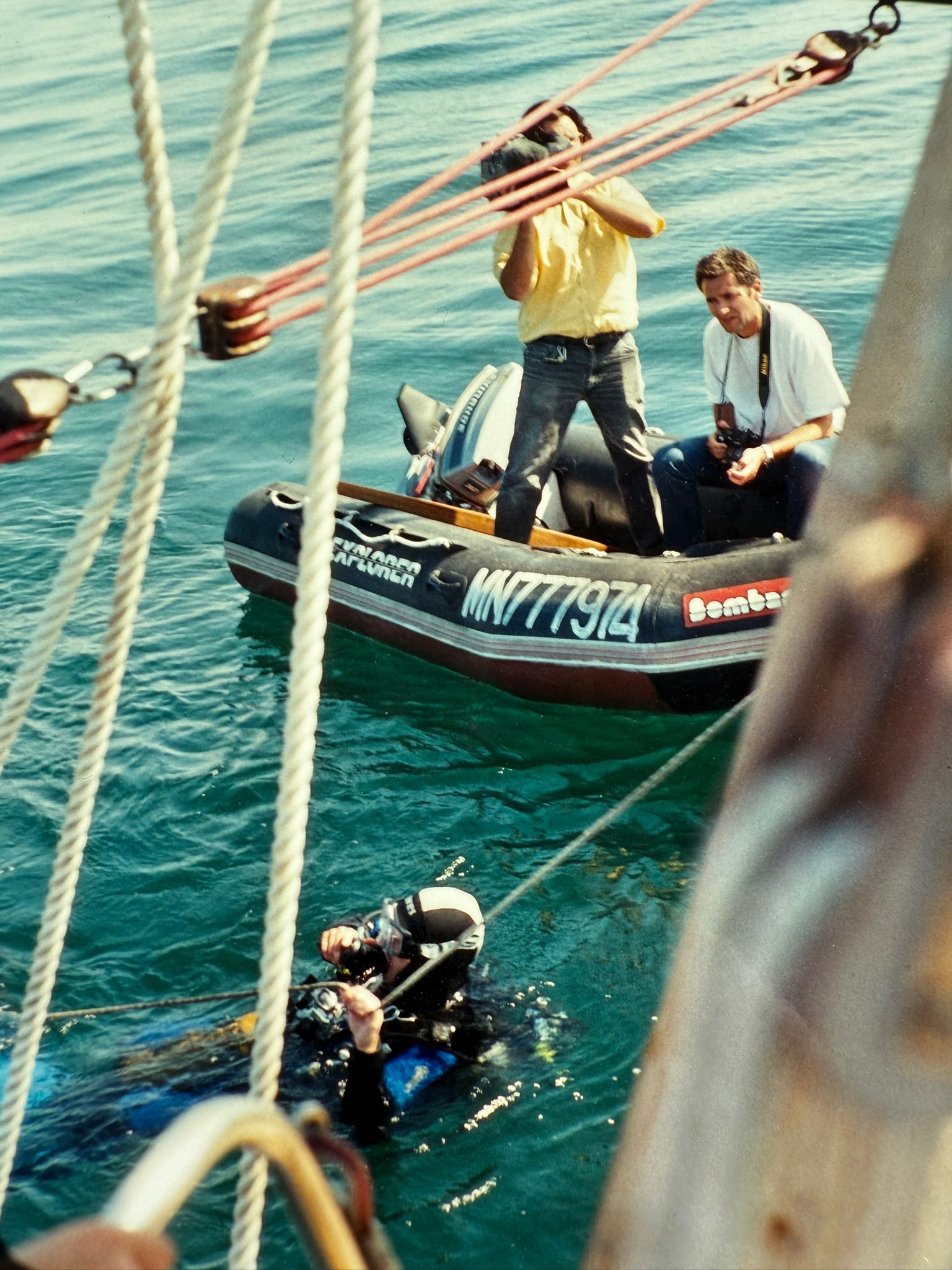 Après quarante cinq minutes un plongeur ressort, c’est bon, le balisage est O.K., le bateau « Galathée » se présente en marche arrière entre 2 flotteurs, au millimètre près…
